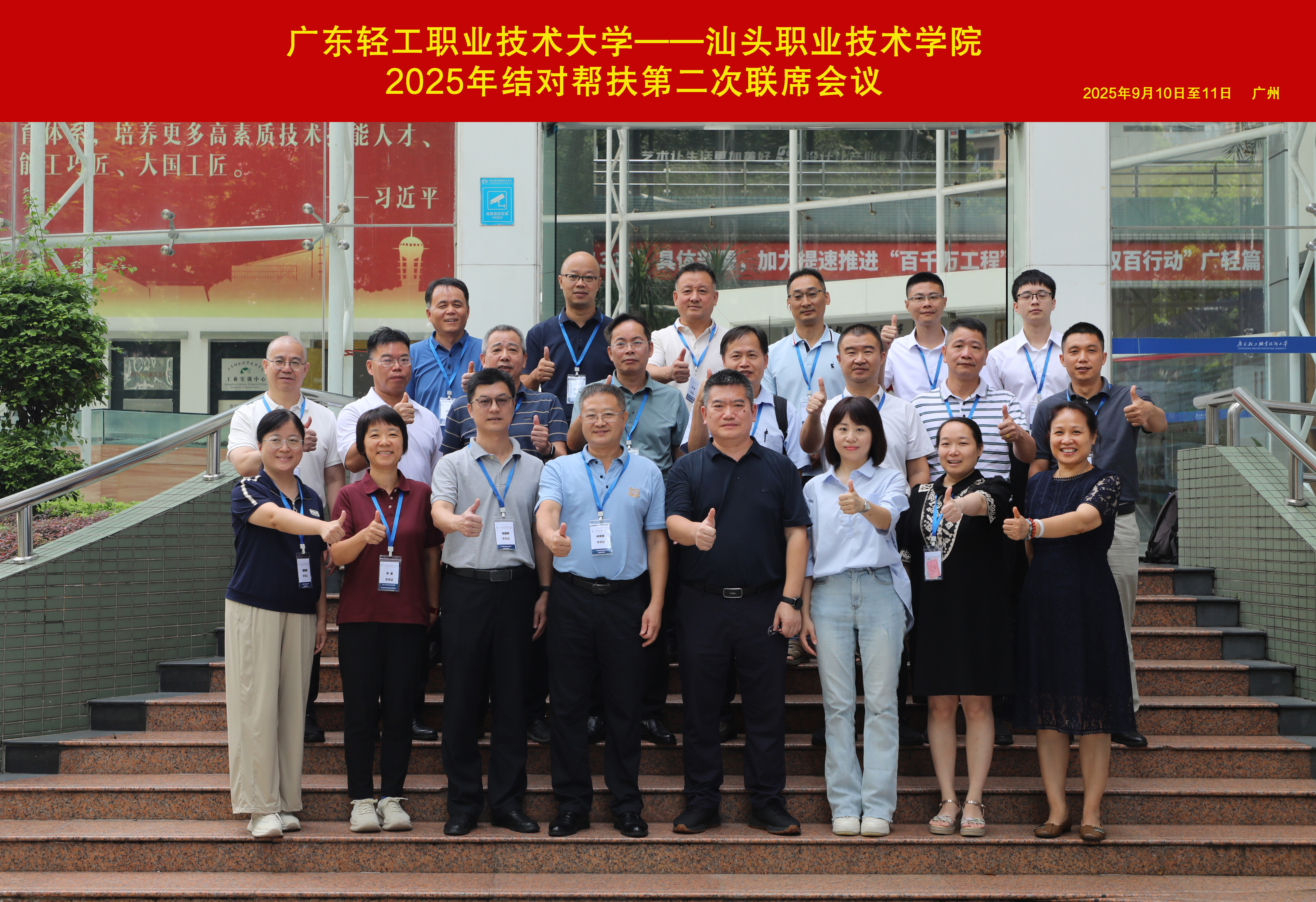 2025年9月10日至11日,我校与广东轻工职业技术大学在广州新港校区顺利召开2025年结对帮扶第二次联席会议。我校党委书记王小辉、党委副书记方小铁、党委委员、副校长林育青,广东轻工职业技术大学帮扶汕职院工作组组长、校长助理秦文胜;广东轻工职业技术大学党委委员、常委、副校长官春平等两校领导出席开幕式。两校相关职能部门及二级学院负责人共计50余人参加会议。
