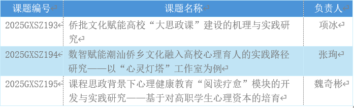 近日,广东省教育厅公布了2025年度广东省高校思想政治教育课题、中小学德育课题立项名单。我校申报广东省高校思想政治教育课题4项,3项成功获批立项,名单见下表。