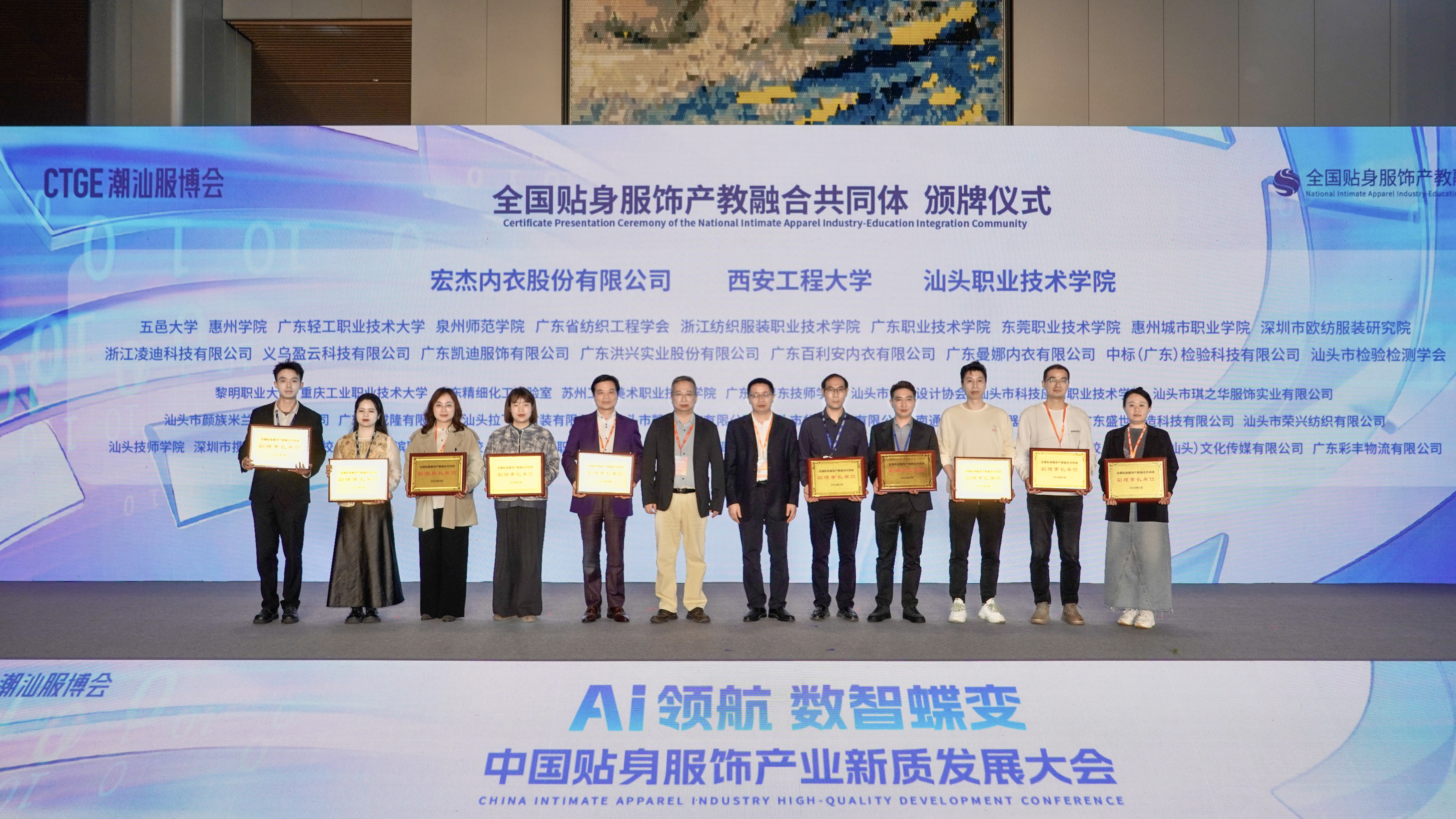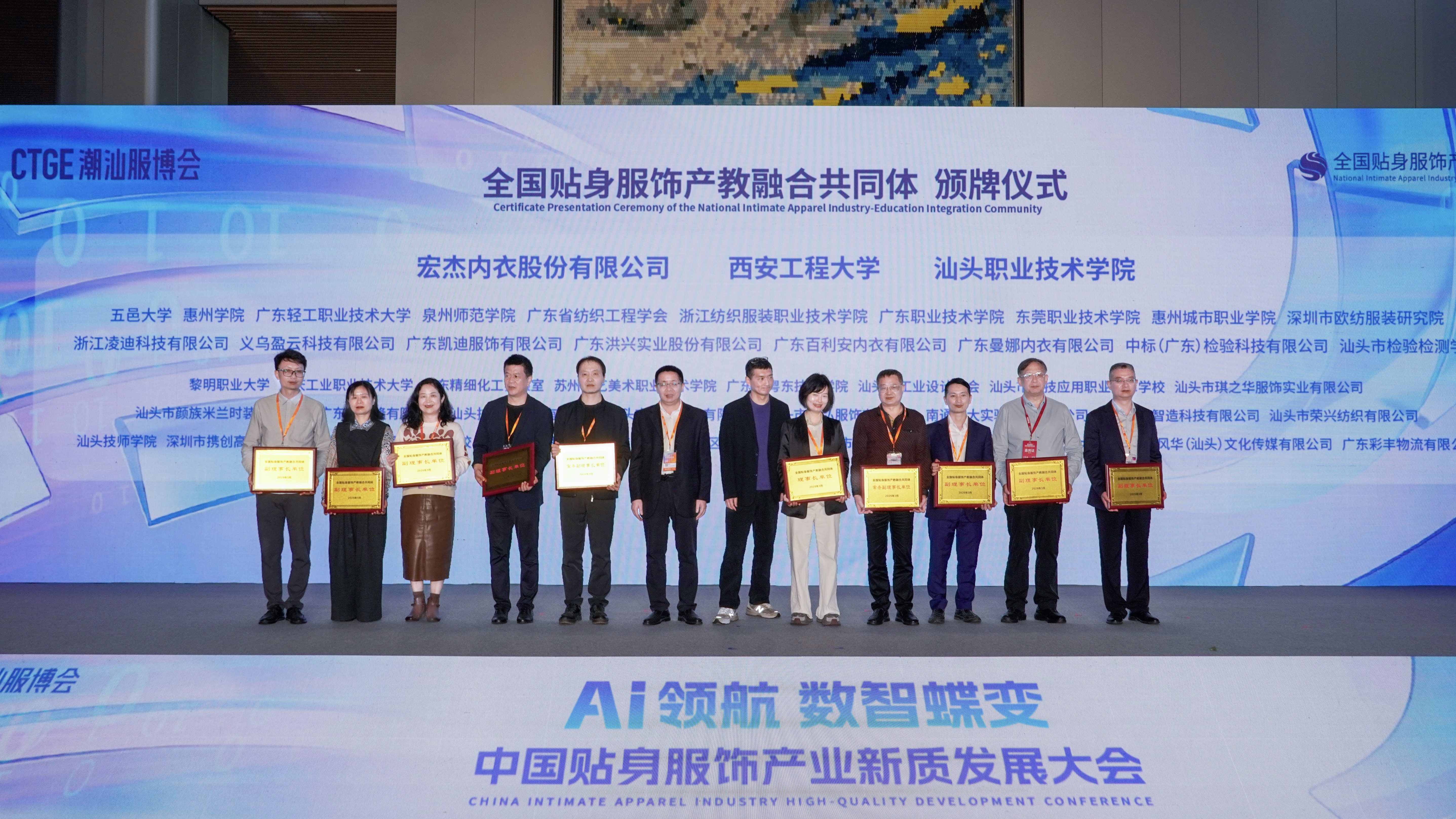 3月18日,全国贴身服饰产教融合共同体(以下简称“共同体”)成立大会暨成员单位授牌仪式在第五届潮汕国际纺织服装博览会期间举行。该共同体由汕头职业技术学院、宏杰内衣股份有限公司、西安工程大学联合牵头发起,秘书处常设汕头职业技术学院,负责日常运营协调。
