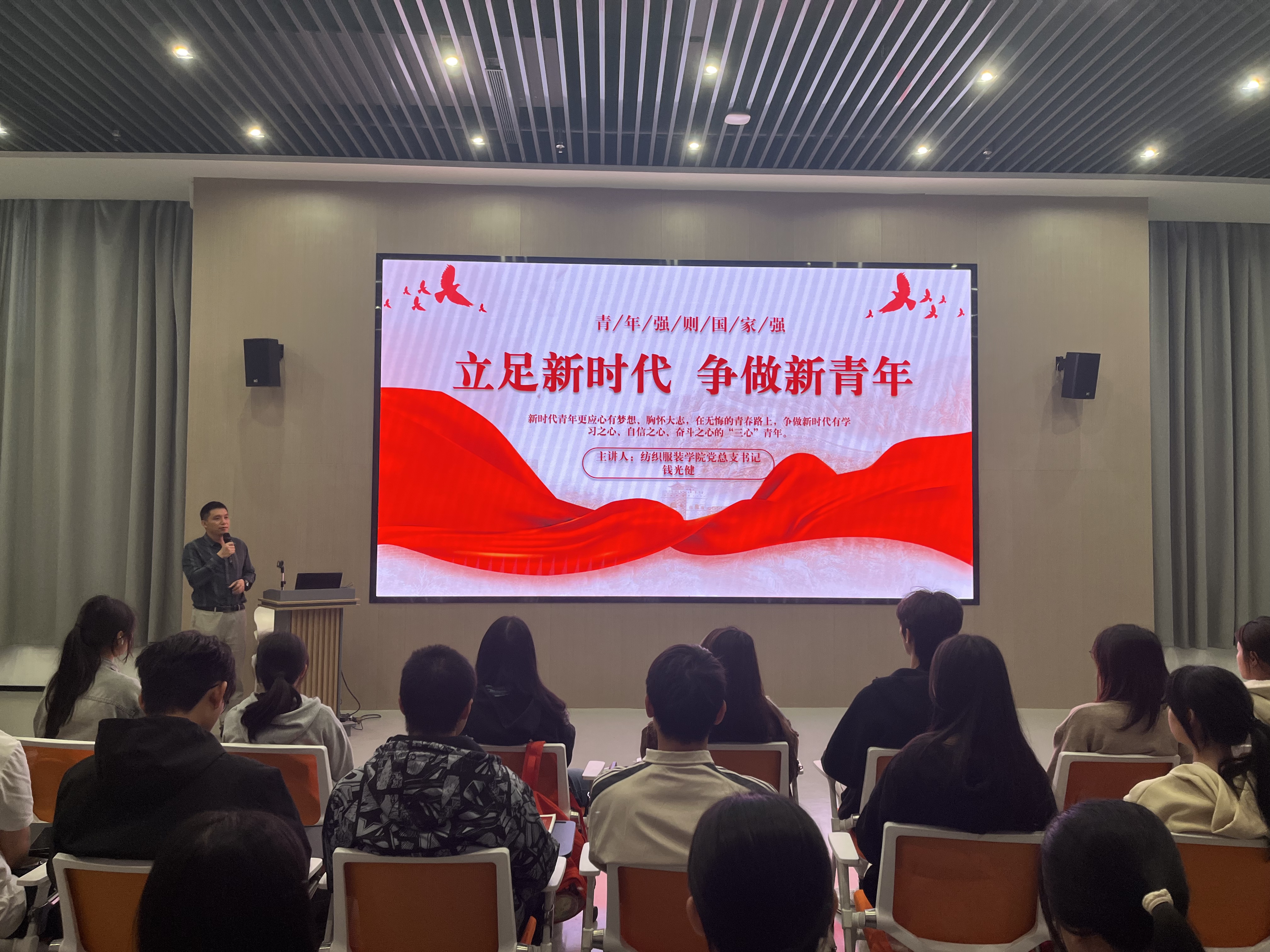 11月27日,纺织服装学院党总支书记钱光健以“立足新时代 争做新青年”为主题,为全体新生带来了一场振奋人心的“开学第一课”。