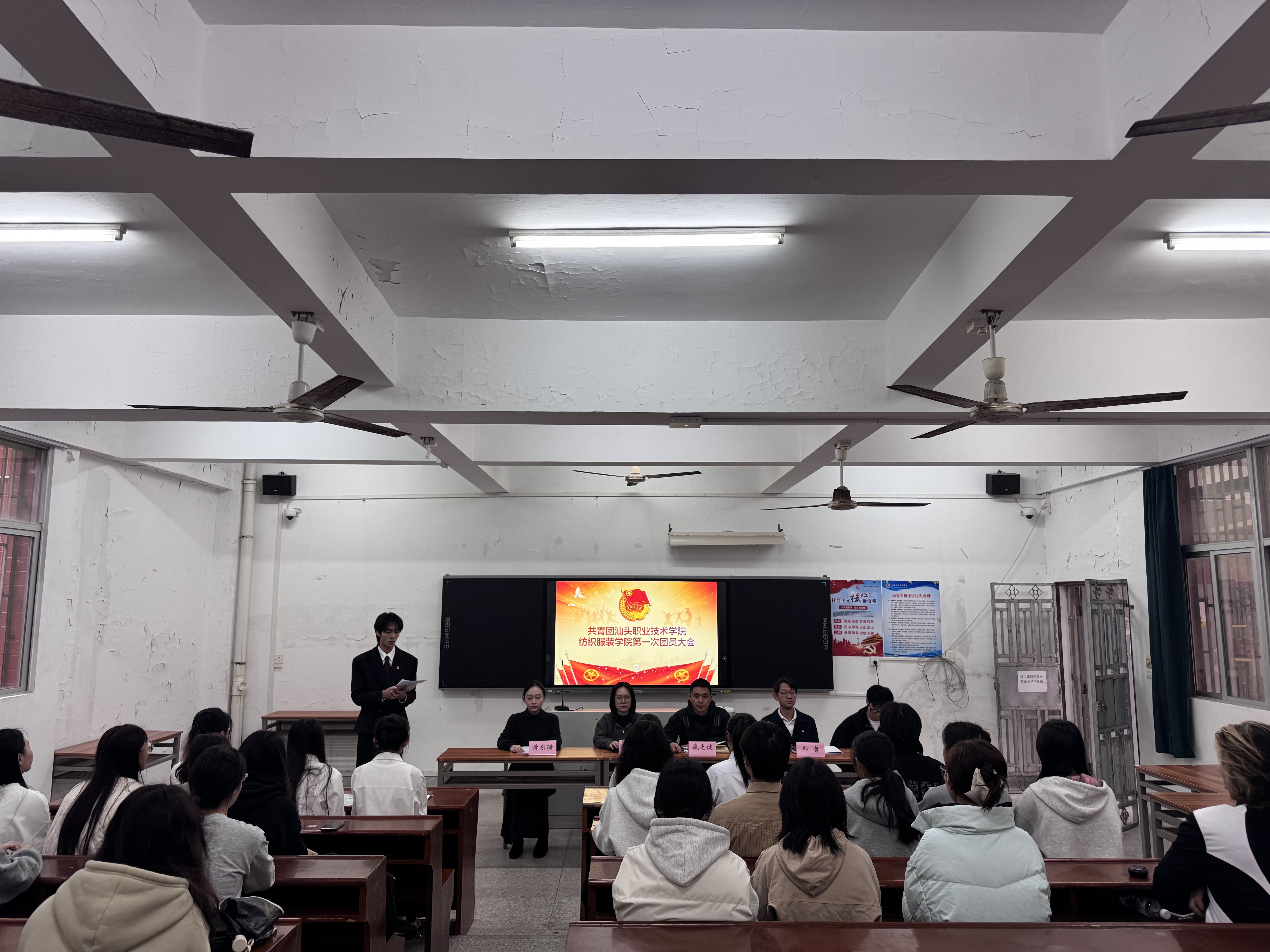 12月25日下午,纺织服装学院首届团员大会于校本部教三区110大教室隆重举行。出席本次大会的有校团委书记邱哲、纺织服装学院党总支书记钱光健、纺织服装学院学生科科长蔡怡楠、纺织服装学院专任教师黄乐璜和纺织服装学院辅导员姚霁冏,学院全体团员共同参与,主持人团学干部许子煜。