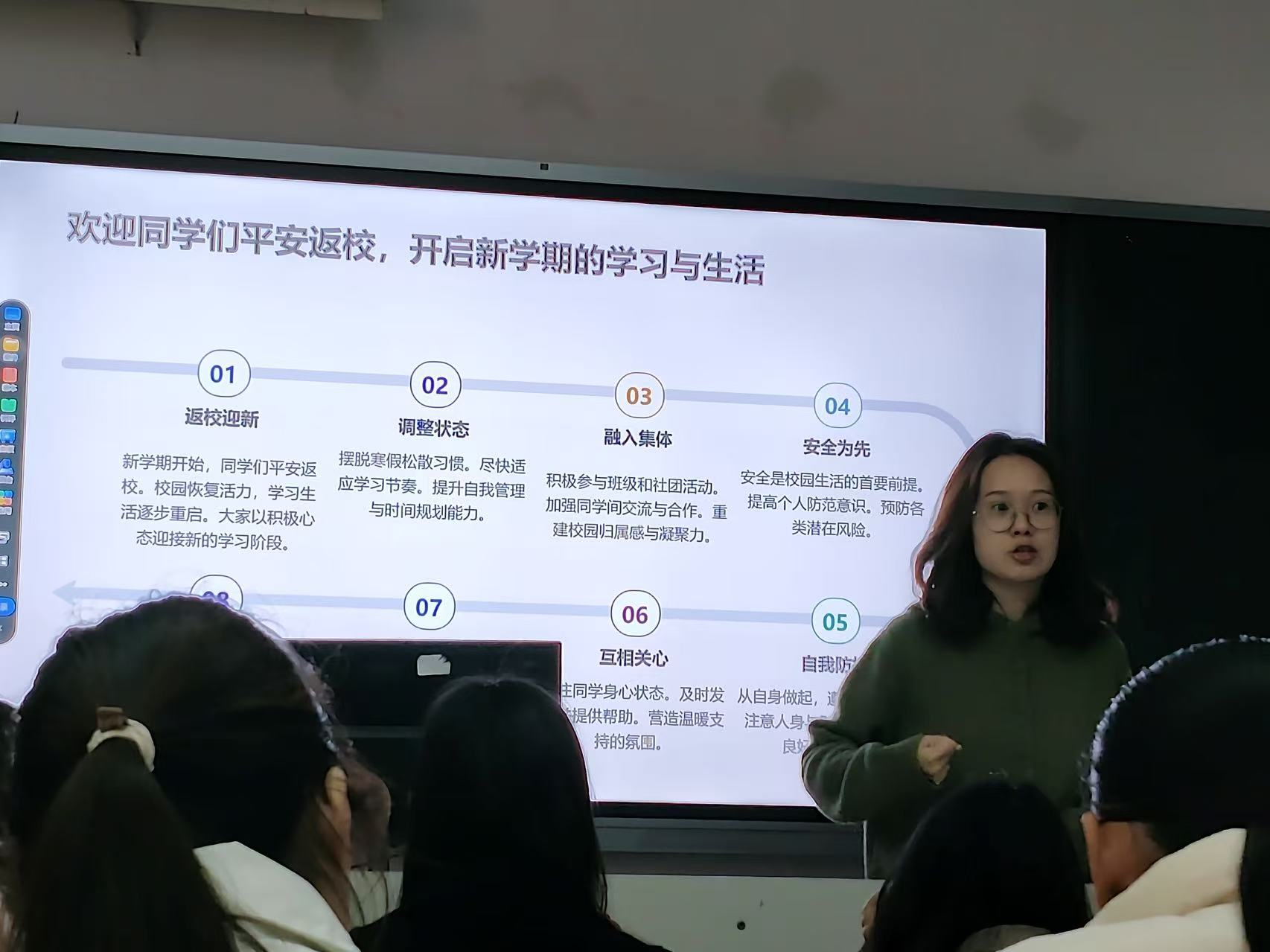 班会紧扣开学季安全重点,从收心归位的身心调整入手,依次围绕政治安全、春季传染病防控、心理健康调适、网络安全与反诈、交通安全与防溺水五大核心模块展开细致讲解。讲解中结合2026年最新典型案例,以案释法、以例警示,让安全知识入脑入心;针对纺织服装专业特色,特别强调设计创作中严守国家立场,将专业特点与安全教育深度融合。