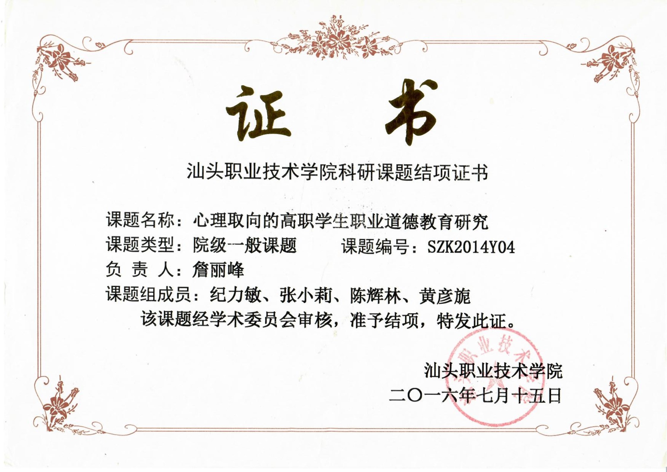 24.汕头职业技术学院创新强效课题《心理取向的高职学生职业道德教育研究》