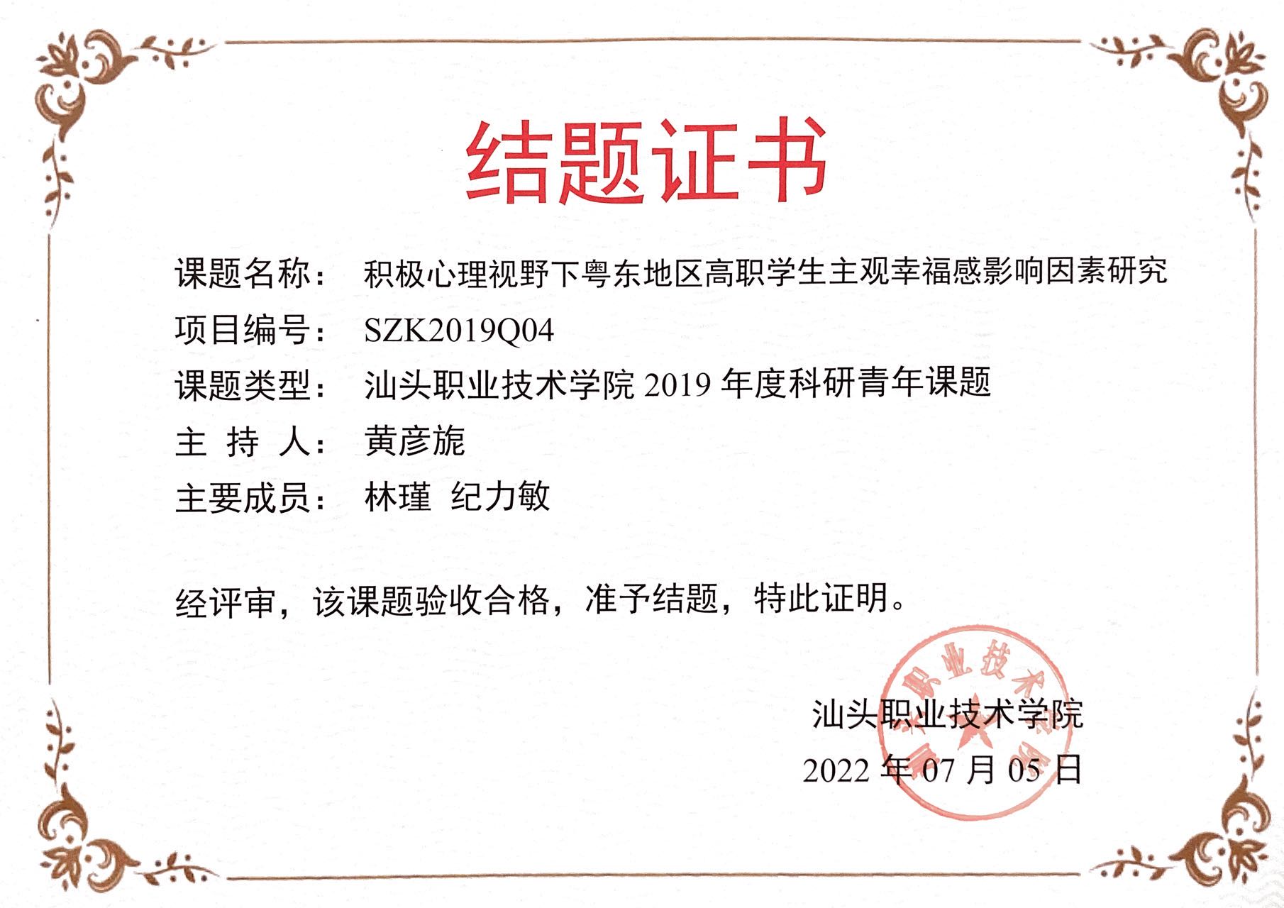 22.汕头职业技术学院青年科研项目《积极心理视野下粤东地区高职学生主观幸福感影响因素研究》