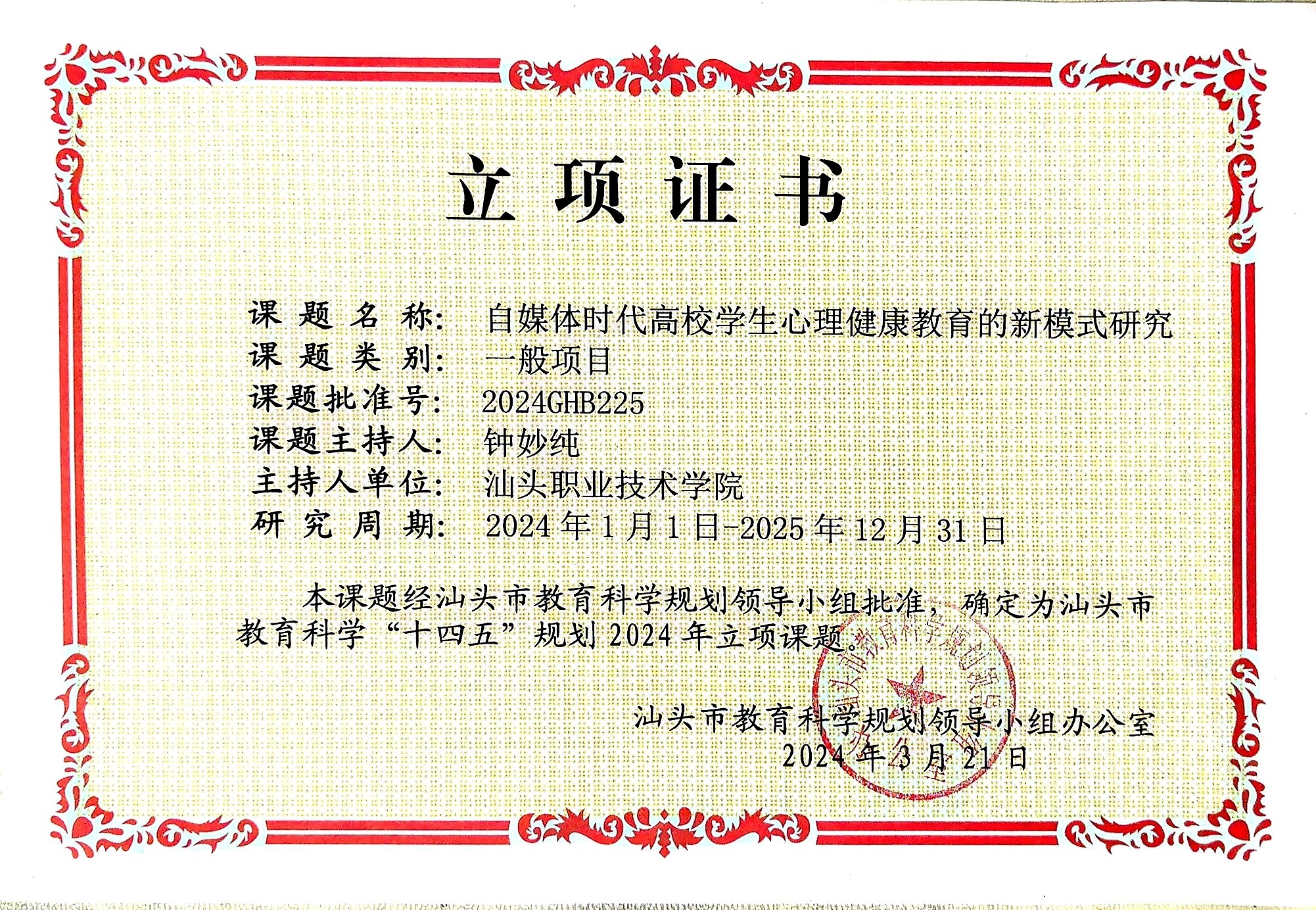18.汕头市教育科学十四五规划项目《自媒体时代下高校学生心理健康教育的新模式研究》