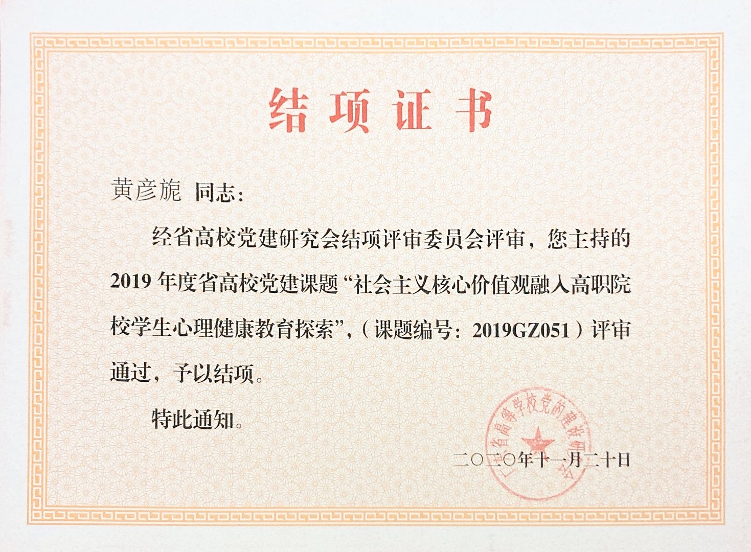 9.广东省高校党的建设研究会党建项目《社会主义核心价值观融入高职院校学生心理健康教育探索》