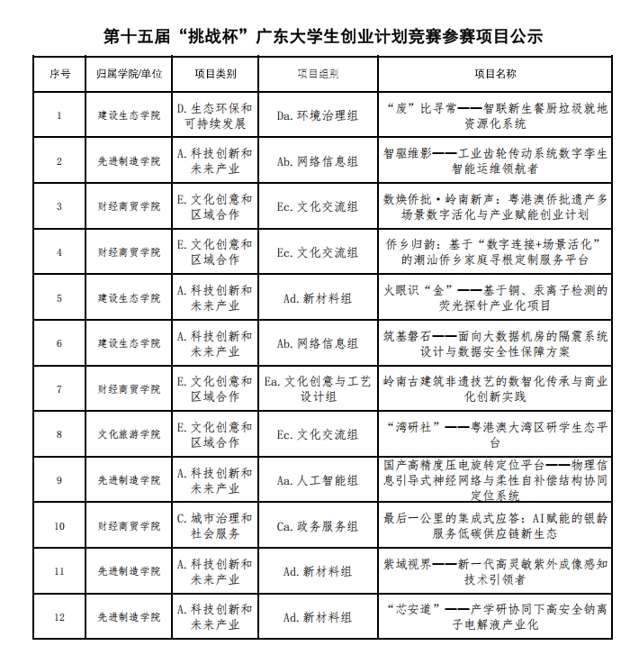 为深入学习宣传贯彻党的二十大和二十大历次全会精神,落实省委“百千万工程”重大战略部署,组织动员广大青年大学生为推动广东高质量发展贡献智慧,支持助力大学生创新创业,为第十五届“挑战杯”广东大学生创业计划竞赛推送优秀项目,校团委于2026年1月—2026年3月期间举办了第十五届“挑战杯”广东大学生创业计划竞赛校级竞赛,得到了各学院的积极响应。经校团委组织校外专家评审团,对各类作品进行评审,现将最终结果予以公布。