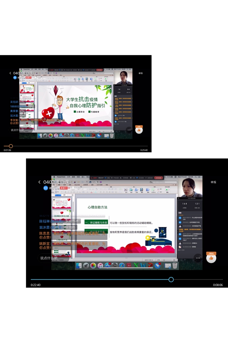 一是老师当主播,在线讲解有关知识。主要由各班辅导员和班主任老师组织学生以线上直播的方式展开。分别介绍了几种常见的心理反应以及调适的方法和建议,要求广大同学积极传递正能量。