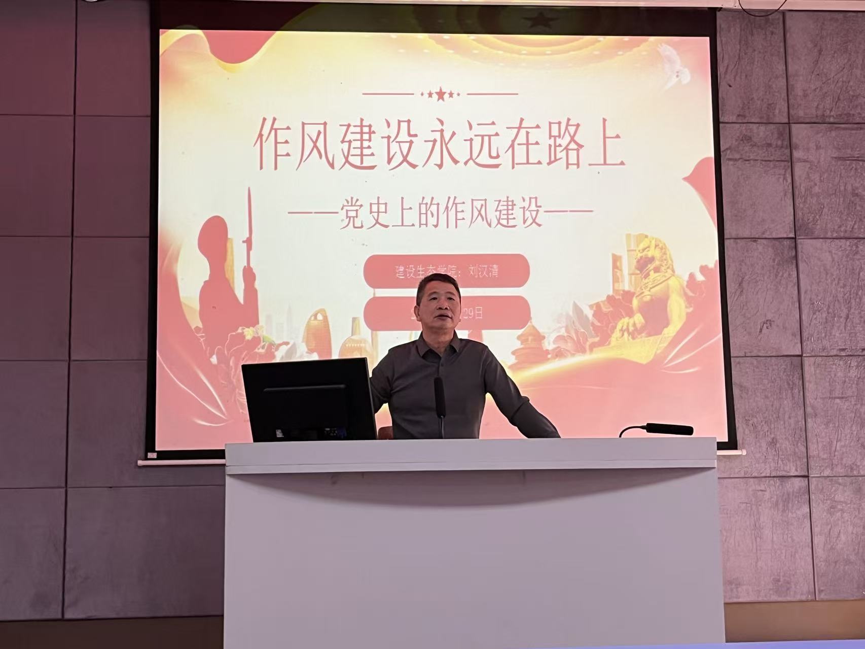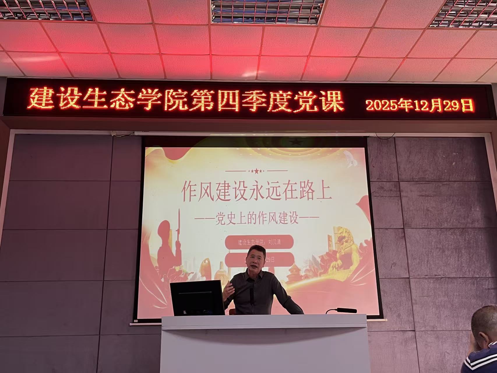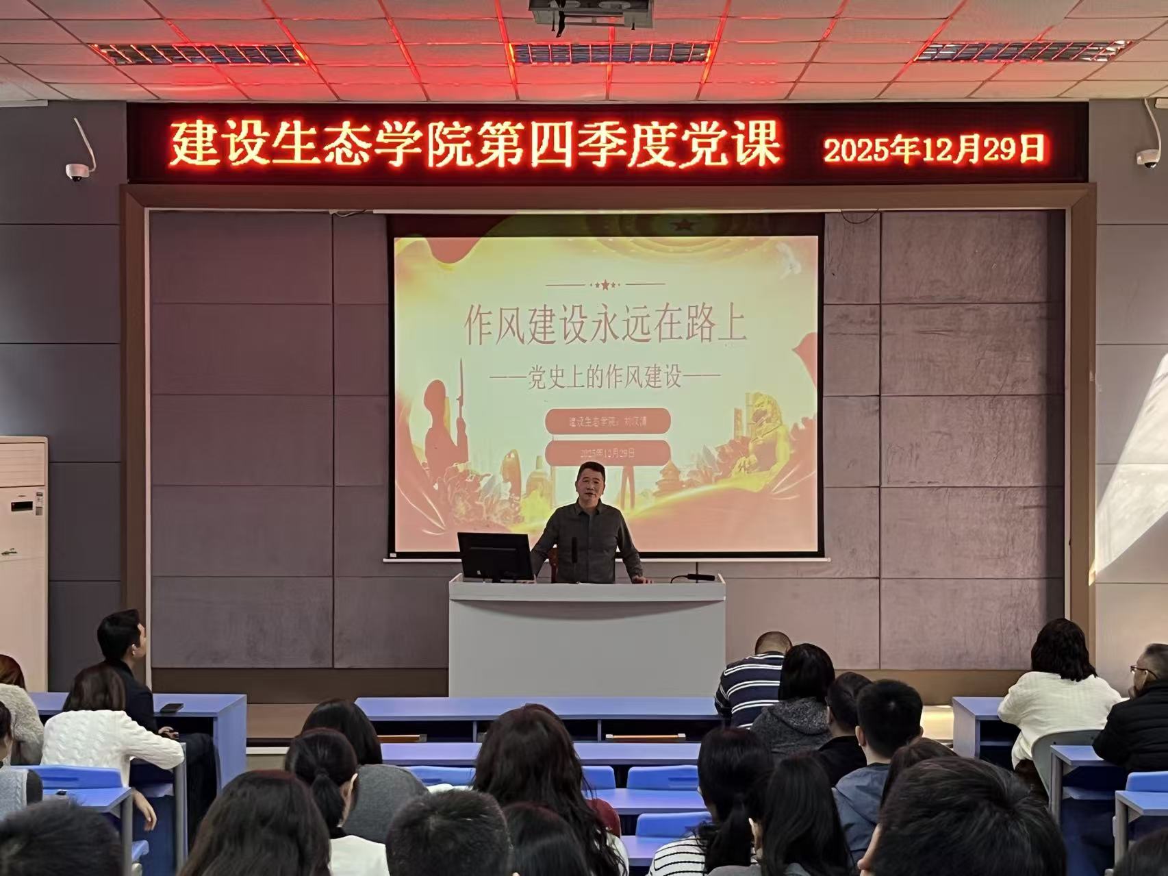 2025年12月29日,建设生态学院党总支书记、院长刘汉清讲授第四季度党课。党课在金园阶梯教室举行,建设生态学院全体教职工党员参加了学习。