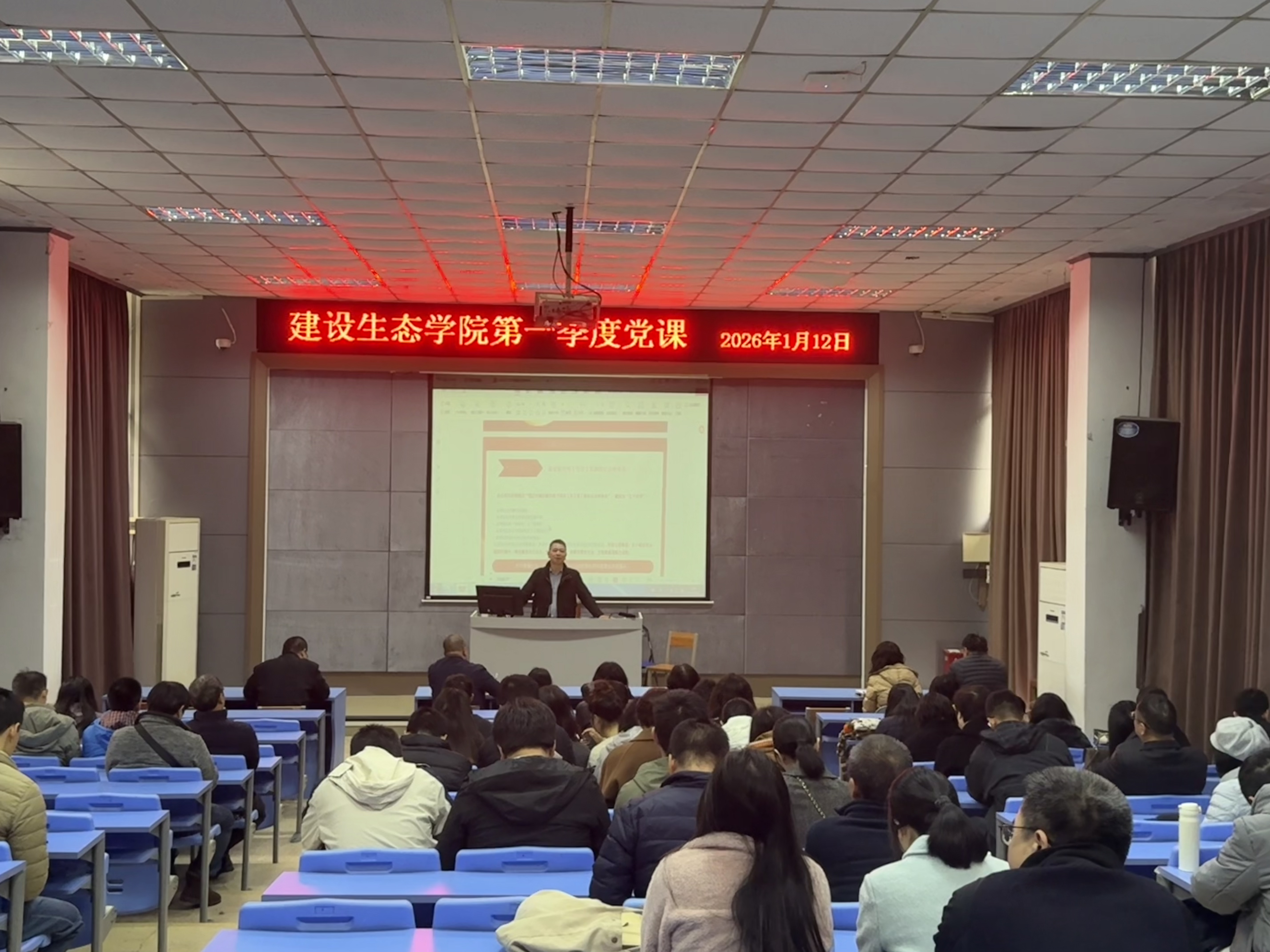 2026年1月12日,建设生态学院党总支书记、院长刘汉清讲授2026年第一季度党课。党课在金园阶梯教室举行,建设生态学院全体教职工党员参加了学习。