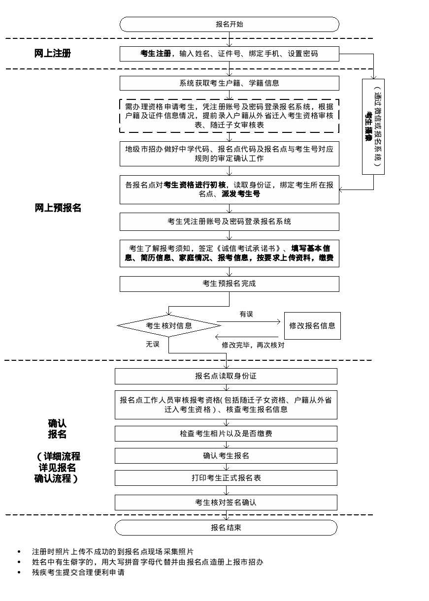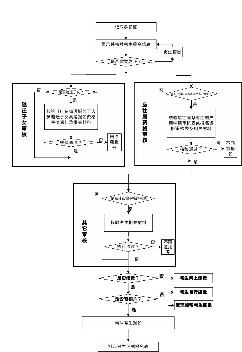 考生信息是考生考试、填报志愿、投档录取、入学报到、电子注册、学籍管理、学历证书办理的重要依据。考生信息错漏可能导致考生无法正常考试、无法填报志愿、无法在教育部备案,毕业时无法获得毕业证书等问题。各级招生考试机构要高度重视考生信息数据的采集和建档工作,建立健全考生信息核准检验机制。各报名点、各中学要认真指导考生完成报考信息的填写、校对工作,指定专人负责考生信息的核准工作,确保考生信息真实准确。一是要坚持考生基本身份特征信息使用电子设备程序统一采集。统一使用身份证阅读器采集考生基本身份数据,使用省普通高考报名系统、省教育考试院官微小程序采集考生相片和人脸特征信息数据。二是要建立健全考生信息核验机制。对于考生填报的信息有电子数据的要充分利用电子数据核验,无电子数据的要求考生在签名确认前认真逐项检查报名表内容,采用交叉检查、工作人员复核等方式加强人工核验,重点加强对户籍地、应/往届、学籍、选择考科目、联系电话等关键易错信息的核验,确保电子信息数据准确。三是要及时处理报名过程中遗留问题。对报名过程中无法处理的生僻字等问题,报名结束后要按要求及时汇总上报省教育考试院统一备案。此外,考生报名后姓名、证件号、户籍、政治面貌等信息有变化,按照“广东省2026年普通高考考生信息修改审核流程”(附件1的附16)申请更正,信息更正办理时段为报名结束后至2026年4月30日以及2026年6月10日至6月12日(注:开考后不再受理高考报名所使用户籍被注销考生的修改信息申请),因考生未及时提交修改信息申请而造成的遗留问题由考生本人承担责任。