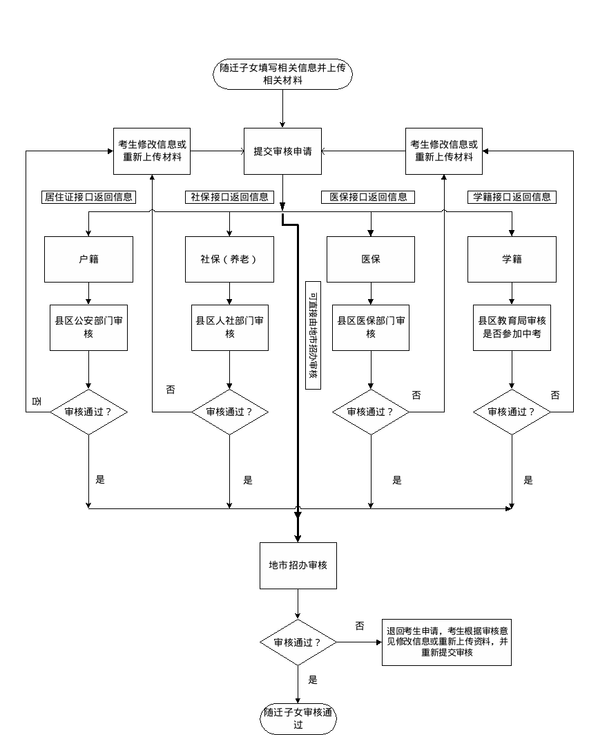 各级招生考试机构要协调相关职能部门,进一步优化机制、简化流程,着力解决考生急难愁盼问题。在随迁子女资格审核、户籍从外省迁入我省考生资格审核、残疾考生合理便利申请审核等涉及跨部门审核的,要及早与相关部门做好沟通协调,明确审核流程,给出清晰指引;尽可能利用网上联审,或利用电子数据比对,减少开具证明要求;对应届毕业的考生,尽可能由中学通知考生提前准备材料集中统一办理。中等职业学校要将报名政策和安排及时通知在校外实习的学生,并组织好相关学生的高考报名工作;对残疾考生申请合理便利等需要现场评估的,要做好指引,并协调相关部门一次完成评估和材料报送工作。